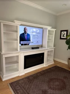 | The Monte Vista is a media center, bookcase, and fireplace mantel all in one. Made of hardwood veneered MDF, the media console can accommodate flat screen TVs up to 60″, and offers plenty of storage space. The Real Flame Landscape electric fireplace will provide supplemental heat for rooms up to 1,000 square feet and offers features such as multicolored flames, pre-set temperature settings, timer, and remote control. Assembly is required. The wooden mantel and electric fireplace Includes a one year limited warranty.