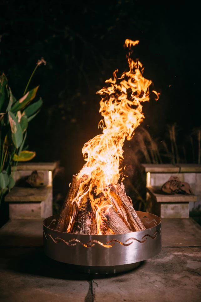| The graceful curves of fire seen thorough the openings in the Fire Surfer remind us of the hypnotic waves that have lapped our shores for thousands of years while we sat ocean side enjoying a meal, a fire and our families. Sturdy eleven gauge steel allows this fire pit to be portable should you so desire taking the fire to that beach you love.