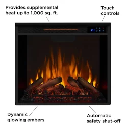 | The Anika electric fireplace has a sleek, stylish design with mantel top that features the natural beauty of wood. Uniquely designed, a reversible surround is included so you can decide what kind of style is right for you. The Real Flame® VividFlame electric firebox mimics the look of a real, flickering fire, but does not require a chimney or vents and conveniently plugs into a standard outlet. This free-standing indoor fireplace has a mantel with a real wood finish and offers six flame colors, five flame brightness levels, adjustable thermostat, timer function and automatic safety shut-off.