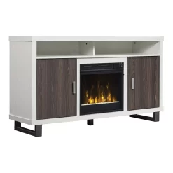 On a cold night, cozy up to this electric fireplace to relax and enjoy your favorite drink. This TV stand with an 18″ ClassicFlame electric fireplace warms up to 400 square feet and is housed in a striking two-tone display. Both the White stand and the Soft Brown cabinet doors feature a beautiful, detailed wood grain. The side cabinets feature adjustable shelves and pass-through holes, providing customizable storage for anything required in your living space. The rectangular, Gun Metal legs and Dark Brushed Nickel hardware blend well with existing dĂ©cor. On warmer nights, turn on the flame effects without activiating the heat function to enjoy a gentle rolling fire all year long. Choose between included contemporary fire glass media or a realistic log set and ember bed to showcase the beautiful flames. This TV stand accommodates most flat screen TVs up to 60” and up to 75 lbs. The 18” ClassicFlame slim line insert ships as a set with this TV stand as a small parcel.